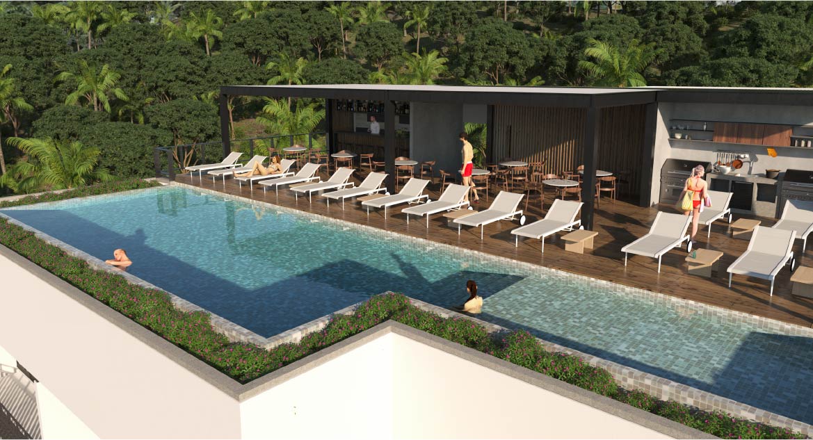 Rooftop c/alberca climatizada, área de grill, skbar y asoleaderos)